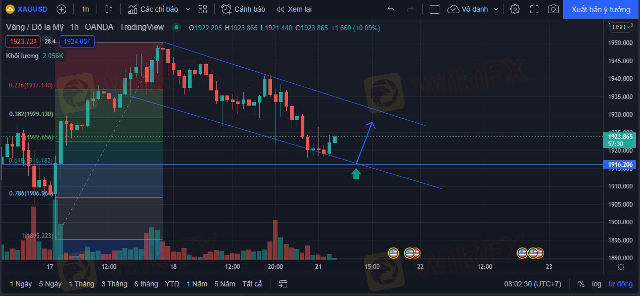 Vàng vẫn đang di chuyển trong kênh giá giảm. Tìm kiếm trên Fibo Vàng có thể hồi về ngưỡng 1915 - fibo thoái lui 61.8
