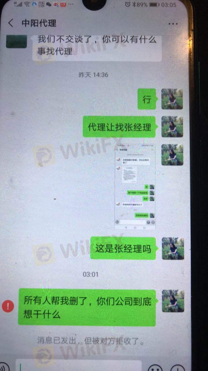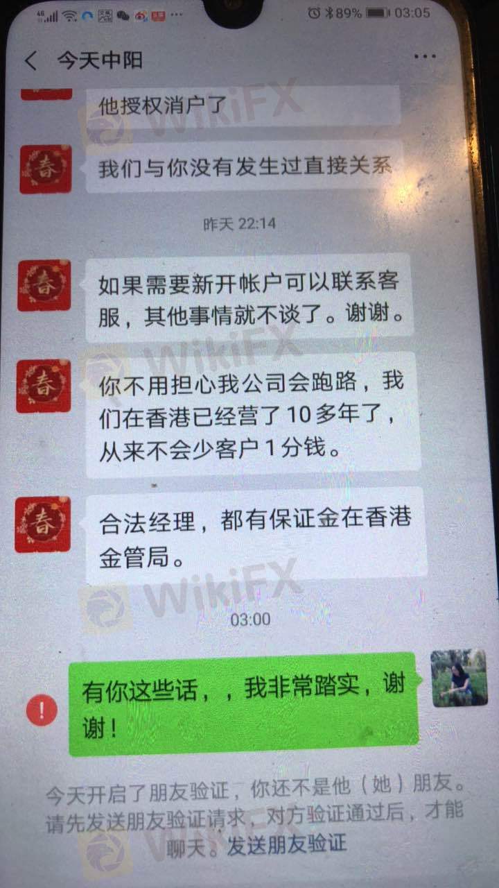 介绍我开户的删了我,然后一直冒充他们在香港,是中阳控股总公司的技术人员也删了我,软件时常登不上,开不了仓,用的是春之舞软件,骗子骗钱,让我凌晨三点还睡不着,每次我爆仓在最高最低,让打交割单,一直没打