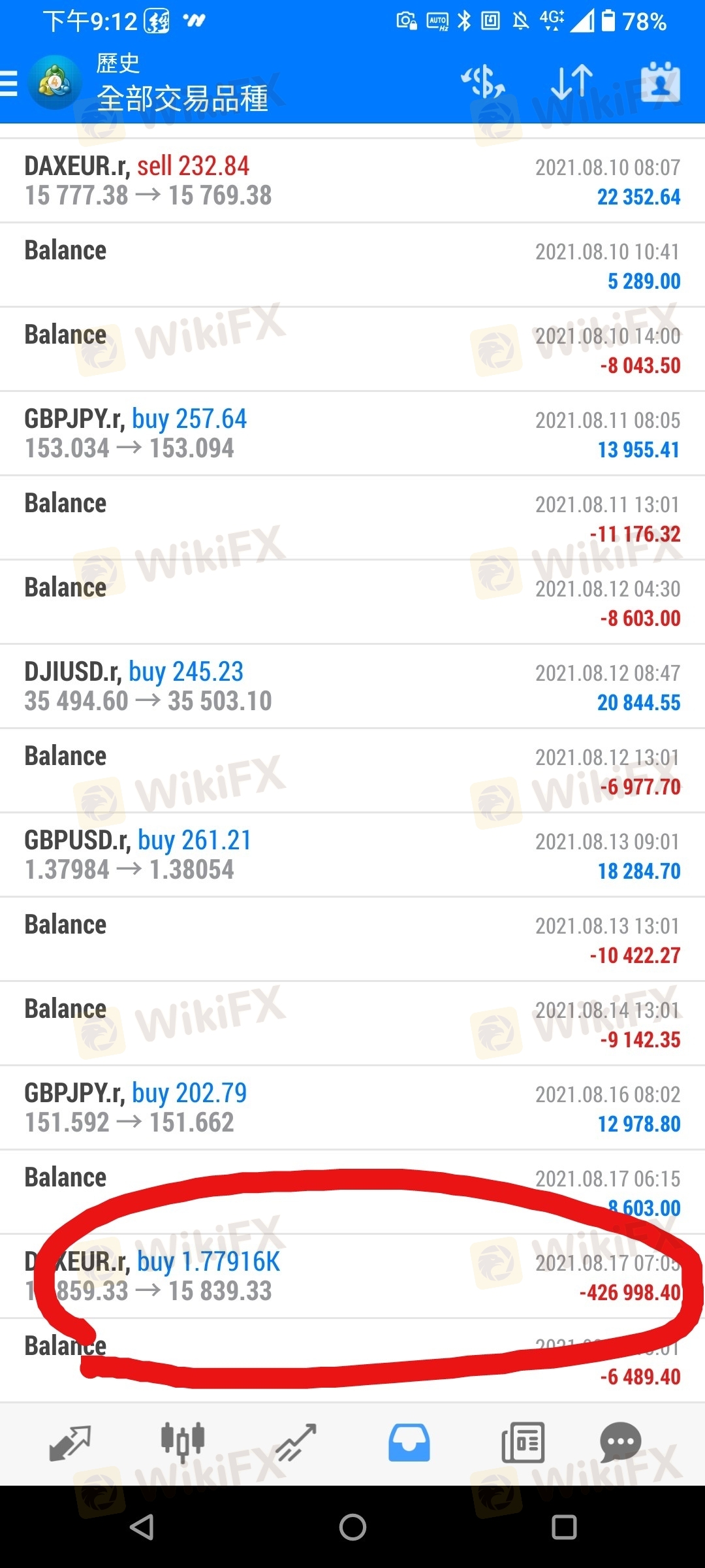 本人自5月迄今共入金417万台币,7月开始交易商以各种理由无法出金, 且交易商网页常以升级为由不断变更。 8/17交易商以被其他交易商围剿为由,本人损失所有金额共426998美金。目前帐户余额为-6318美金,帐户金额为负更令人不可思议。提醒大家GLENBER交易商实为诈骗,切勿入金。目前报警也束手无策中,切记。