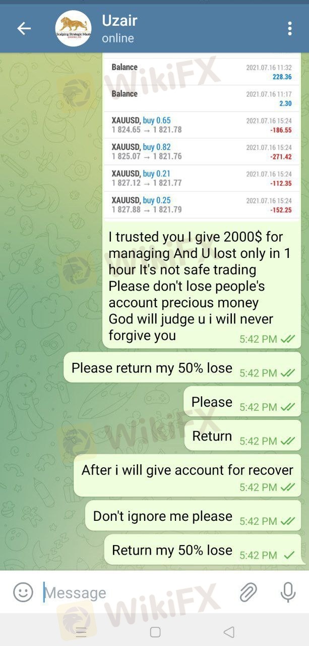 I contacted this guy who provides account management service. I found his service inside broker's telegram channel. So i decided to approach him. He told me he can give me a return of 60% daily. Originally i deposit 1k USD, but then i added more money because he guarantees 60% return daily. Only in 1 hour, 50% of my fund was gone! Ridiculous strategy and bad money management! I think he purposely lose the money so the broker can earn! He wont return or even answer my calls!
