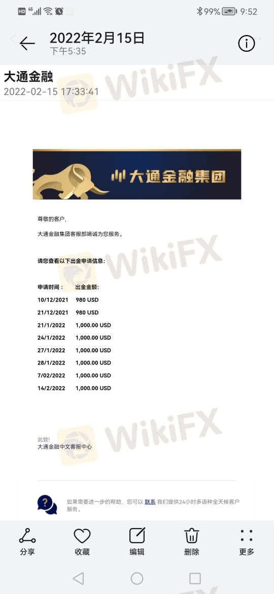 我的账号88845513,大通金融依然没有解决出金问题,一分钱拿不到自己的钱,出金申请无数次了。