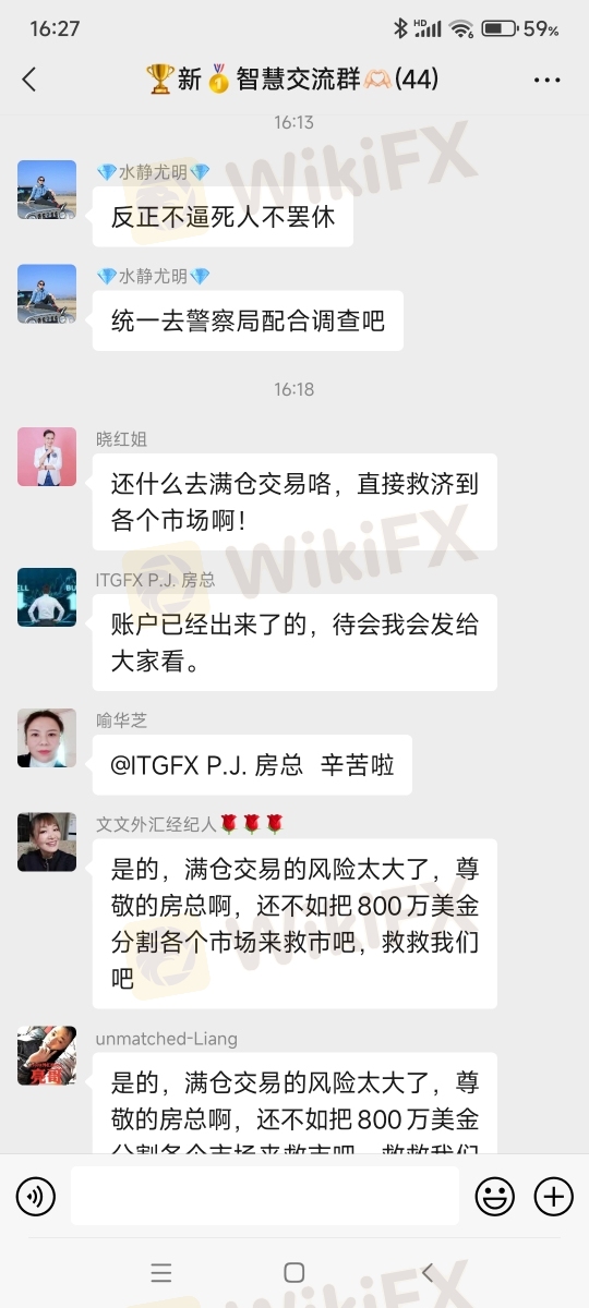 尊敬的领导们好,我是2019年十一月份加入ITGFX这家公司的,评分从一点几到后来的七点几,法律援助从C级上升为A级,所以我们从来没有怀疑过公司,团队做到了一百八十几万美金,但七月二十号凌晨发现账户余额为负数,公司说被黑客攻击,时间过去快一个月了也没一句话,我们也无法联系到公司领导人,现在只能委托帮我们追回损失,讨回公道,维护咱们的正当权益,感谢感谢