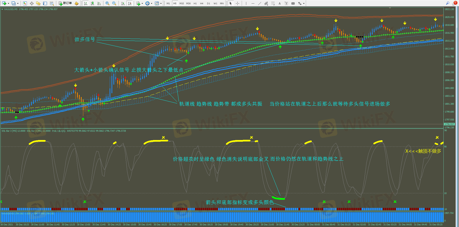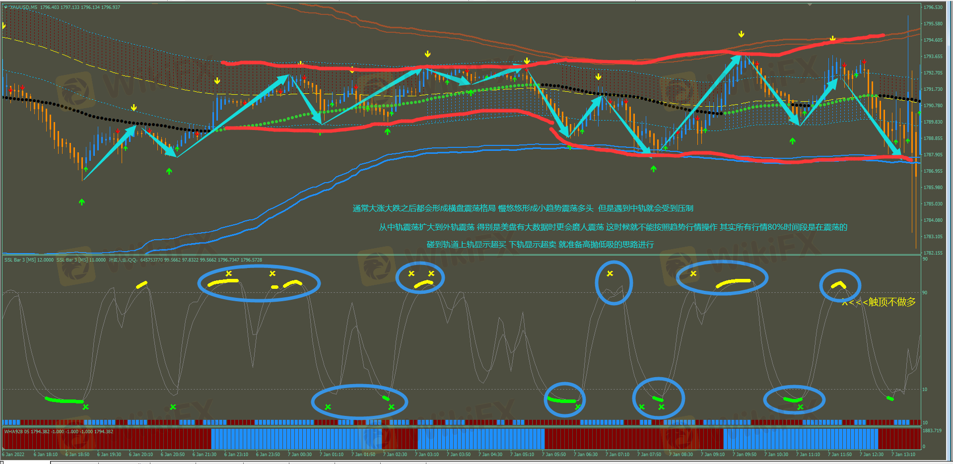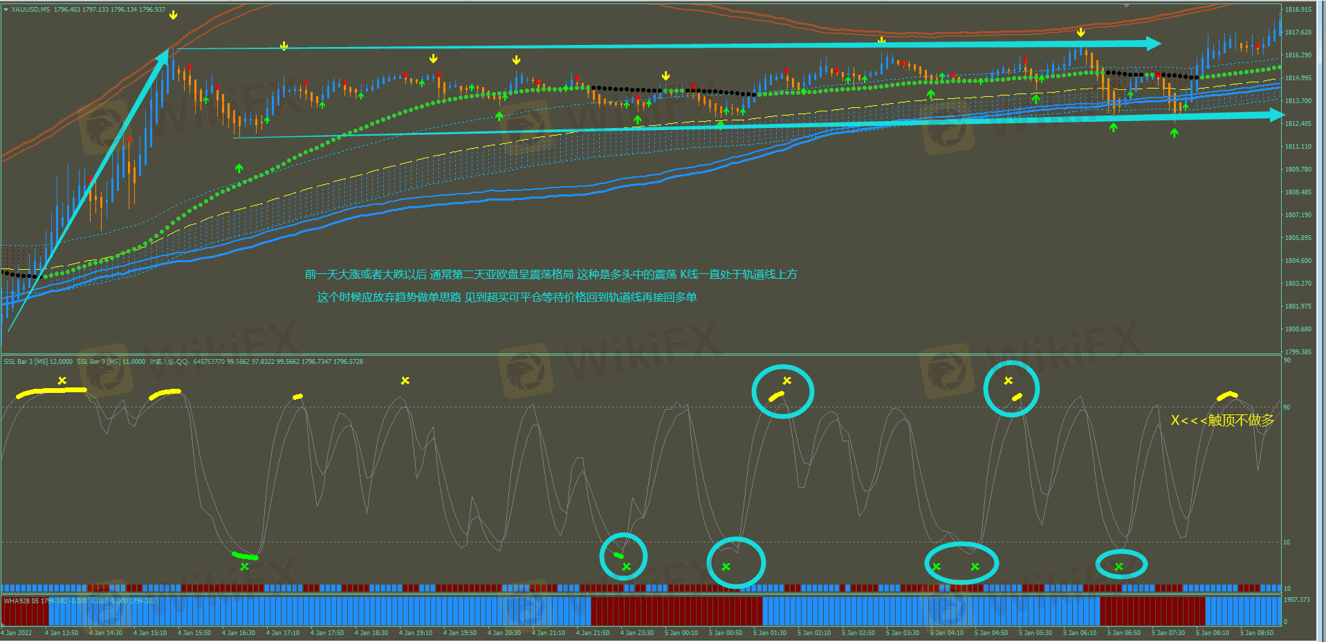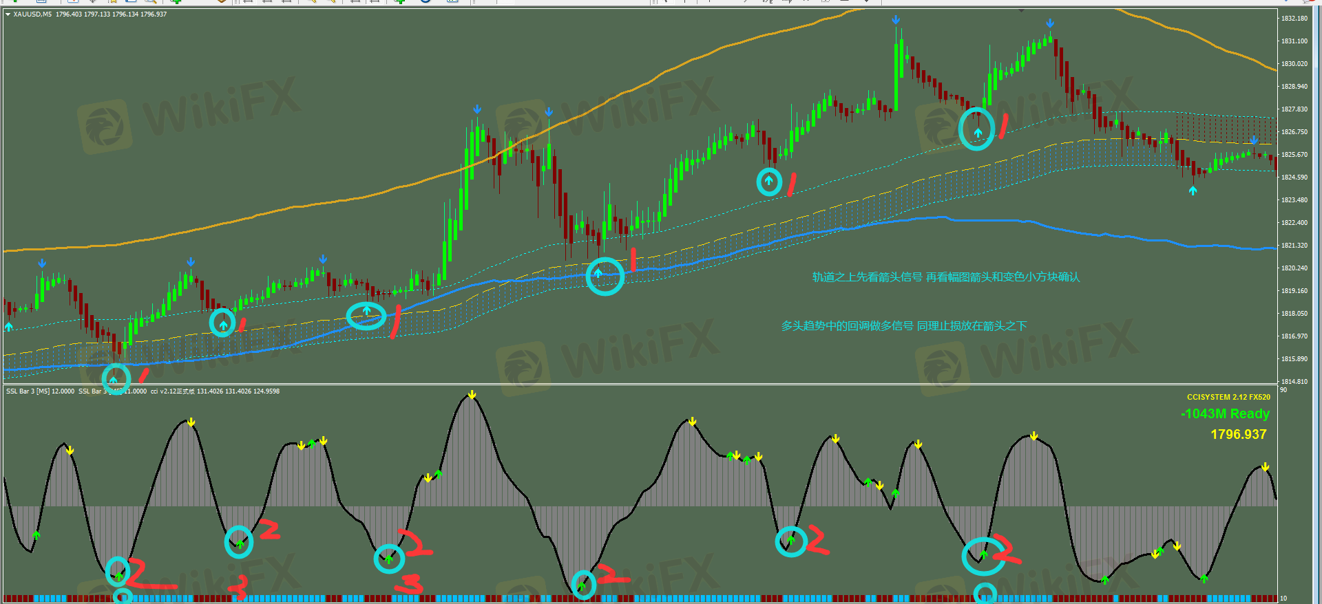 关于趋势的判断,当价格在轨道1和变色趋势线之上时,认定其为多头趋势,即使是震荡也看做是多头行情中的盘整,反之亦然,想做空就先看价格是不是在轨道和趋势线之下显示空头颜色,然后再配合幅图超买超卖指标和进场提示指标进行下单。