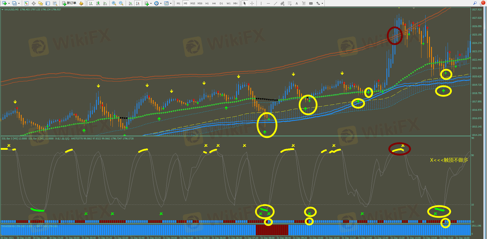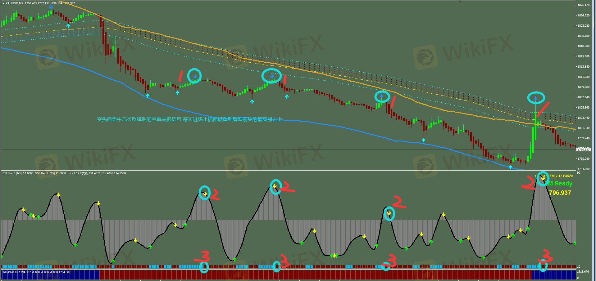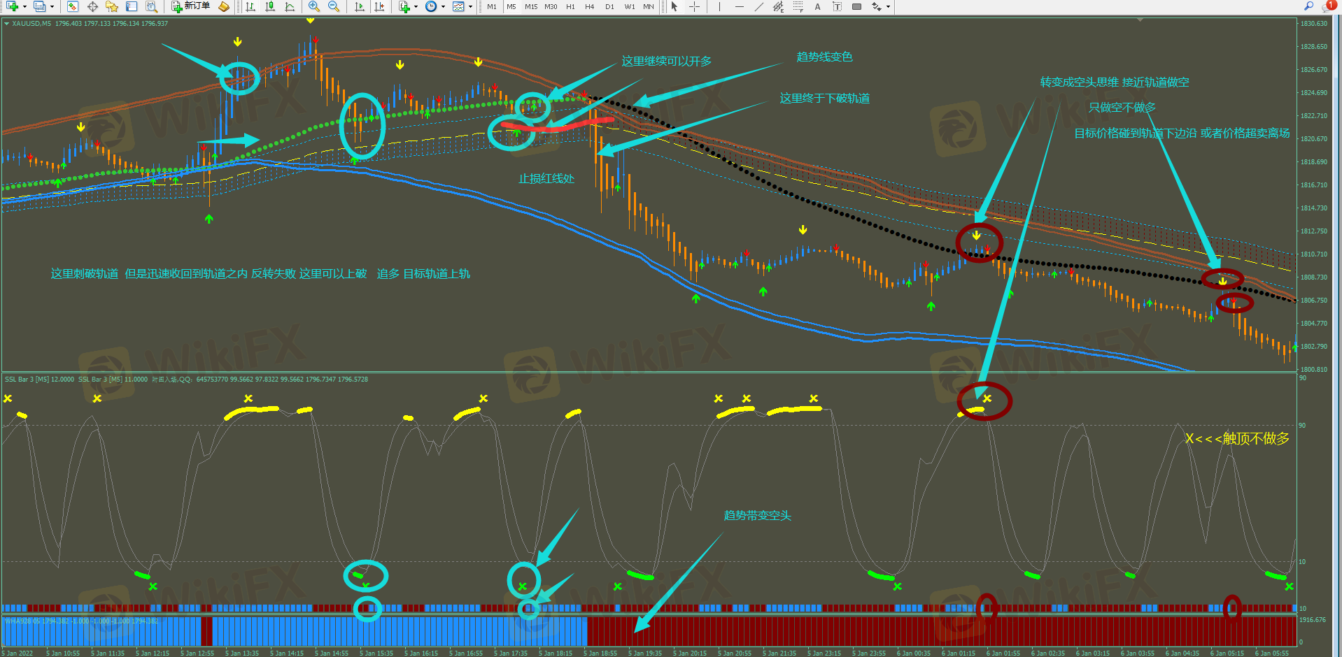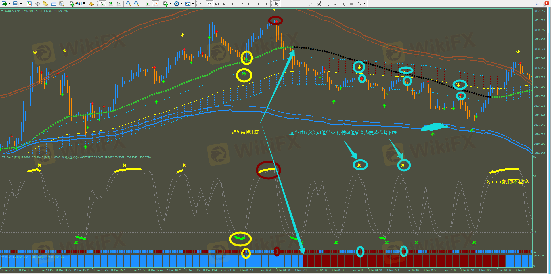 关于趋势的判断,当价格在轨道1和变色趋势线之上时,认定其为多头趋势,即使是震荡也看做是多头行情中的盘整,反之亦然,想做空就先看价格是不是在轨道和趋势线之下显示空头颜色,然后再配合幅图超买超卖指标和进场提示指标进行下单。