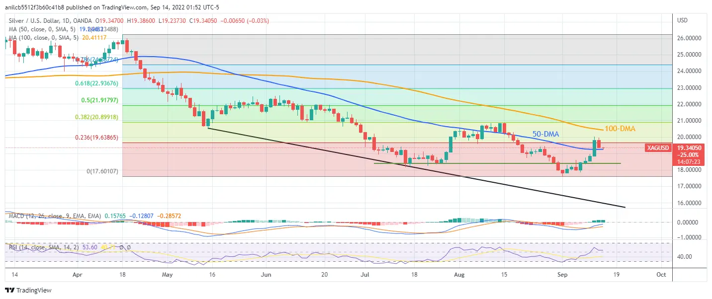 白银价格努力延续前一日自一个月高点以来的回调 MACD信号看涨,50日MA均线挑战白银/美元空头 100日MA均线限制短期上行,两个月水平区域构成额外支撑 由于50日MA均线在周三欧洲时段早盘限制白
