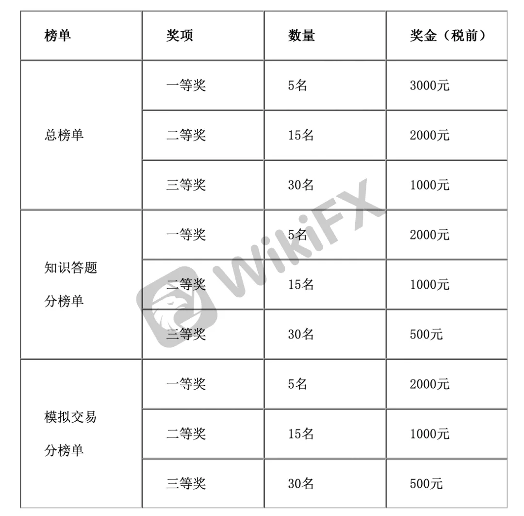 按照竞赛结束后的总积分排行榜、知识答题排行榜、模拟交易排行榜分别设置一、二、三等奖,每个榜单授予50人次奖项,其中一等奖5名,二等奖15名,三等奖30名。总榜单各等次奖金分别为3000、2000、1000元,两个分榜单各等次奖金分别为2000、1000、500元(均为税前金额)。三个榜单奖项不重复计算,扣除总榜单已获奖选手后为知识答题分榜单选手按名次颁奖,扣除总榜单及知识答题分榜单已获奖选手后为模拟交易分榜单选手按名次颁奖。