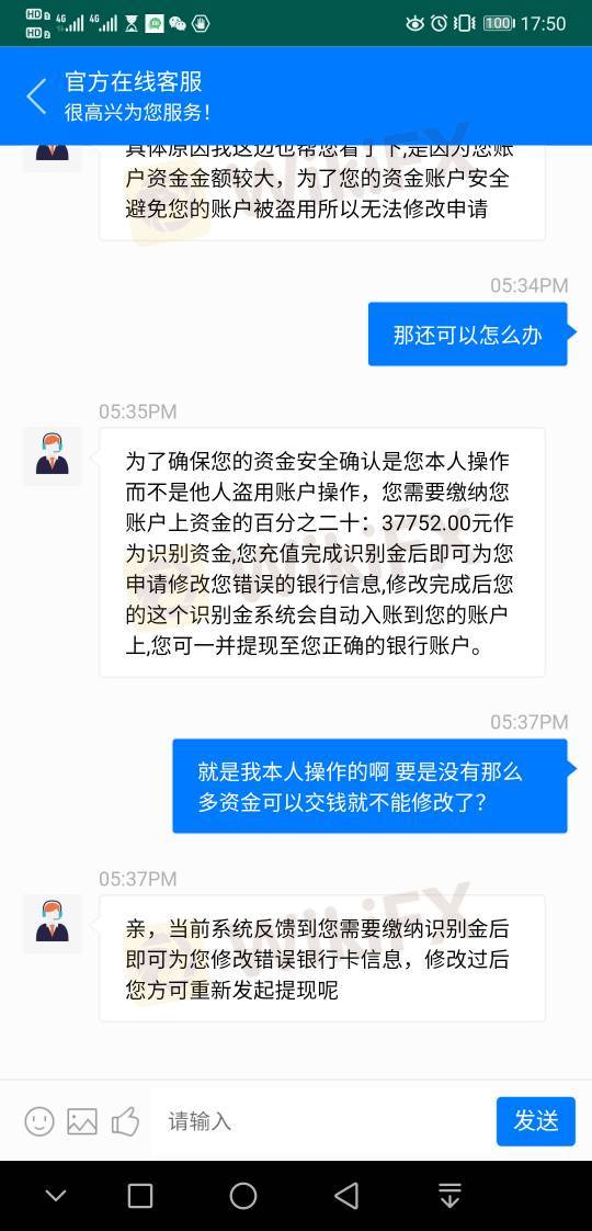 朋友圈里自稱是代理的人,在微信朋友圈公開發布以有專業數據團隊老師帶領指引操作在外匯平臺“愛匯”入金進行短期貨幣交易項目,展示有百分百本金5-10倍的盈利,在朋友圈每天發布與投資者入金和提現成功的聊天截圖。下載“愛匯”客戶端后,入金到客服指定的一個賬戶成功后與其團隊專業老師通過“米聊”客戶端語音操作,操作完成提交銀行卡信息是復制的銀行卡號,并非手動打,可以保證無誤。第二天上去顯示提現被拒,問客服后說系統因為銀行卡信息不對打款不成功,無法自己修改,后讓客服改,再次提供銀行卡信息后,幾分鐘后說被系統駁回,說因為賬戶金額大,為保證是本人操作需要繳納賬戶余額的百分之二十的識別金(賬戶18萬多,要交3萬7千)后才可以申請修改后再次提交提現,沒有理會。平臺修改銀行卡賬號,想利用投資人不舍得賬戶里金額的心理騙取再次入金,入金后又會以各種理由無法出金繼續讓你不斷充錢進去。貪婪貪心已導致被騙了,希望這曝光可以讓人知道這種代理和詐騙模式,幫助到還沒入圈套的人。