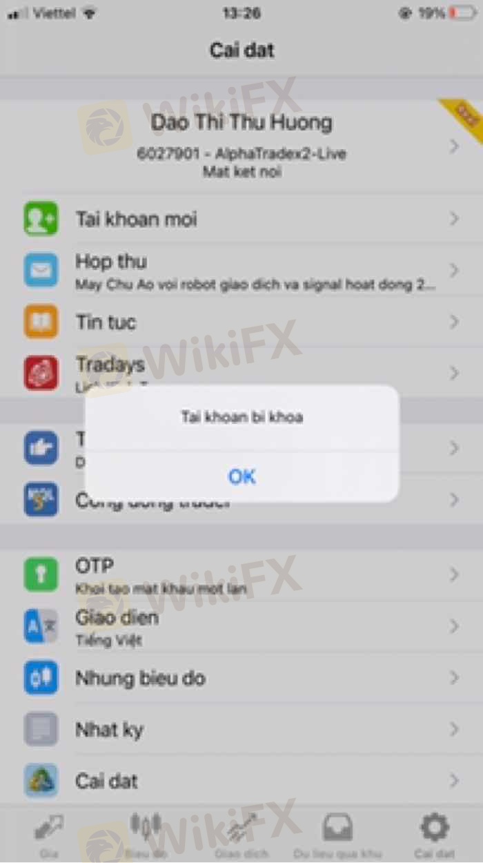 Sàn alphatradex ôm tiền của ndt , không trả tiền vốn . Khoá tài khoản khách hàng . Trượt giá khiến tk cháy . Không hỗ trợ khách hàng khi gặp vấn đề . Scam tiền , không cho rút tiền , tự ý trừ tiền và xoá lịch sử giao dịch của khách hàng Nếu không xử lý cho chúng tôi. Hoặc ko có phản hồi , chúng tôi sẵn sàng nhờ đến pháp luật và báo chí vào việc . Chúng tôi ko thể chờ đợi thêm được nữa , yêu cầu trả tiền cho chúng tôi