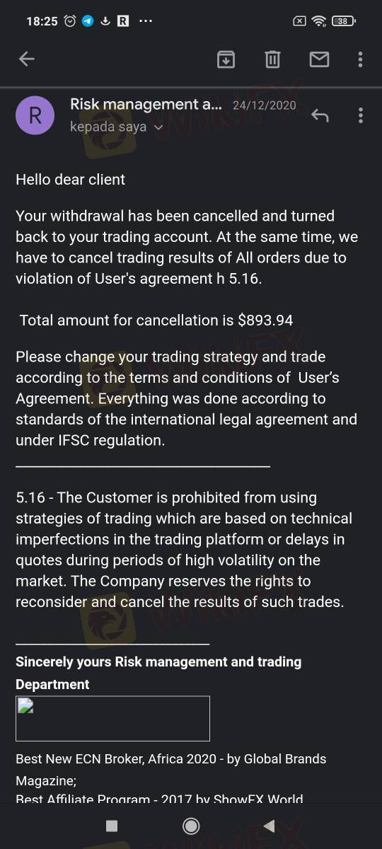 我是一名普通交易員,我於2020年12月23日提取了我所有的錢。但是突然我的利潤被取消,並收到了這封電子郵件。我嘗試了很多次給他發電子郵件Super Forex但他們只會發送內容相同的電子郵件。這真是令人失望,據說經紀人已經獲得了獎勵,但是這樣做是不公平的!