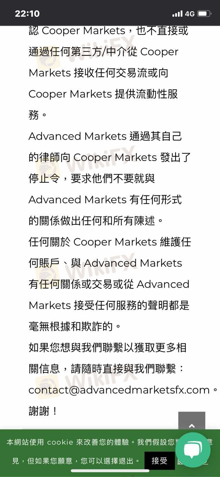 這是一個資金盤,資金根本沒有到流量商,還公告是流量商問題,向流量商發律師函,但是流量商根本沒有承認Cooper Markets, 現在負責人無出面回應,錢包的資金也無法領出!