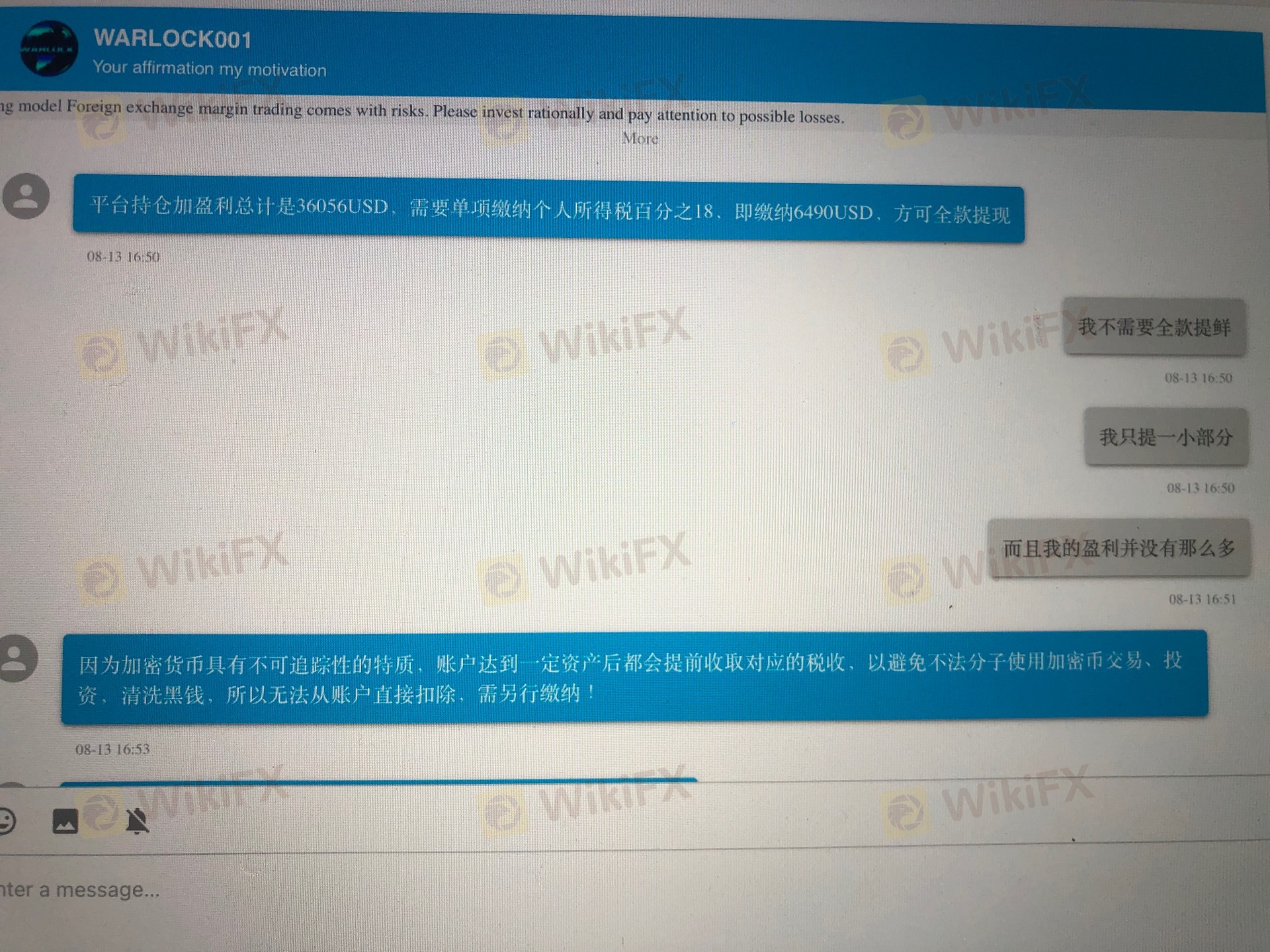 這是一家騙子公司,入金30000usd,開始幾次盈利后,順利取出1000+usd,之后再進行出金,說出金不可以超過盈利的60%,且如果出金需要先繳納 本金+盈利共18%的稅金,稅金不能從盈利中取得,需要額外繳納。但所有這些,這個公司網站根本沒有相關說明。再次操作部分出金幾天后,所有賬戶貨幣被清空,客服不做回答,整整20萬RMB被騙光,大家一定遠離,用戶們小心的同時也希望平臺給予一定的關注和處理,懲治這群騙子,以免更多投資者上當受騙。
