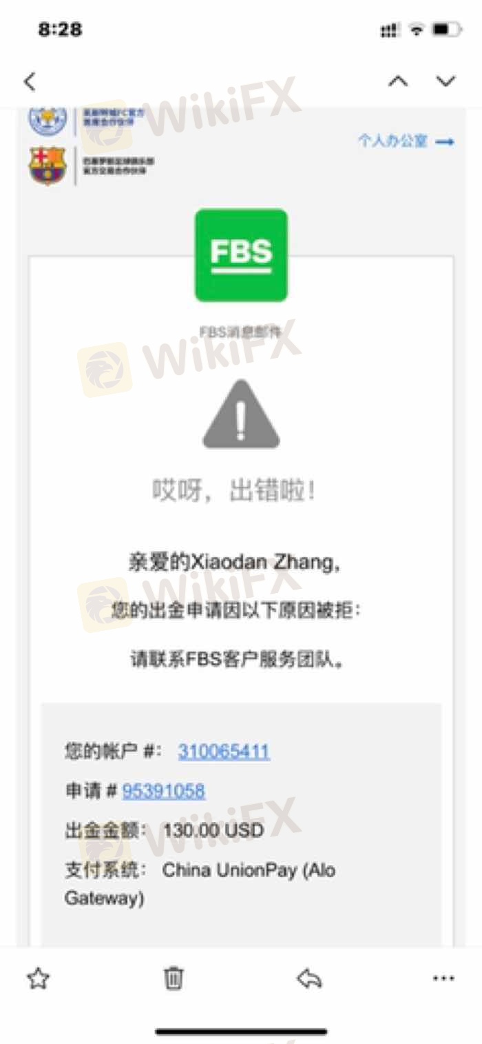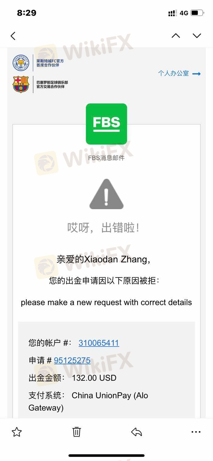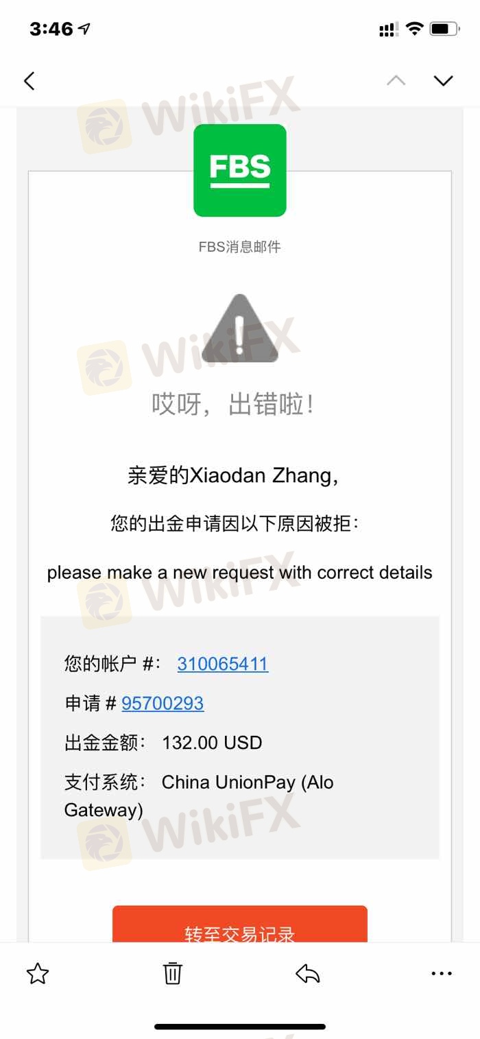FBS平臺網址是https://fx-fbs.cn,多次拒絕我的出金申請,哪怕我賬戶的資金只剩下132美金,他都會以各種莫須有的理由拒絕我,按照他們的意思就是填寫當時入金的農行卡賬號,農行卡開戶行,他們都是一律拒絕。我轉而通過SKRILL方式申請出金,他們又要我選擇銀聯,我再次銀聯出金,他們又是拒絕。我要求平臺馬上毫無理由的給我剩下132美金都匯到之前的農行賬戶上去。