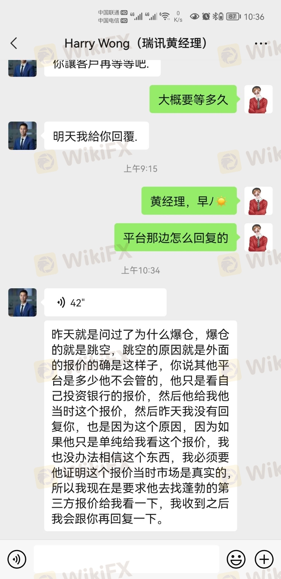 本人朋友在瑞訊平臺交易,本來都是沖著瑞訊安全穩定才選擇用這個平臺,結果瑞訊黑心平臺,在4月5號鎊鈕品種惡意滑點和擴大幾十個點差,導致我朋友十多萬美金爆倉,后面找到平臺問這個為什么和其他平臺報價不一樣,客戶經理黃志聰說會向平臺申訴,并且說當時平臺流動性供應商彭博報價也沒有這么低,在找交易室給出證據,但是幾天過去了還沒有給出明確回復,可能平臺還不想負責,所以瑞訊不是安全平臺,是黑心平臺,不知隨意更改報價,擴大點差,給客戶造成損失,而且強平還有負值,平臺的強平機制也有問題,我希望這個事情曝光出來,讓大家引以為戒,不要用這個黑心平臺,這個平臺不值得信任