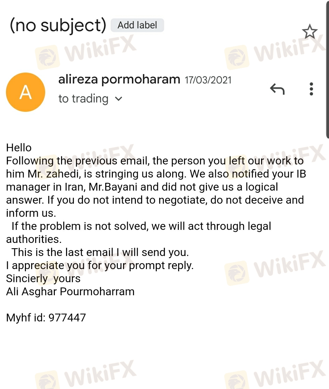 HF Markets。向 HF Markets 發送投訴的日期:2021 年 3 月 12 日 今天日期:2022 年 6 月 24 日 親愛的 hf 市場:我向您發送這封電子郵件是為了抱怨將您的業務暴露給伊朗并針對伊朗實施制裁,這導致您奇怪的行為。導致我和我的客戶蒙受重大損失的不當行為。您對我的損失負有責任的部分是: 1 - 通過突然增加傭金和點差,您開設我的帳戶只是為了最大化您的傭金,這是一種嚴重的欺詐行為。 2- 您多次未能向我提供實時證券價格,更糟糕的是,您根據您的不真實估計價格出售了我的一些持股/頭寸,然后發現與實際價格相去甚遠。由于這些股票從未以您進行交易的價格達到。您絕對要對由此造成的損失負責。 3 - 通過不允許對沖我的頭寸,你拿走了你必須提供給我的所有工具來阻止損失。如果您遵守制裁伊朗的規定,您不必在我們活躍的交易中切斷我們,并使我們蒙受巨大損失。美國、歐盟和其他地方的當局實施制裁和限制。違反制裁的處罰很嚴厲。所有與伊朗進行貿易的公司或向伊朗境內的自然人付款或從其收款的公司都將受到這些處罰。我有權收到您因不遵守規則而傷害我和我的客戶的所有錢 我希望收回的確切金額是..... 很長一段時間后,沒有對我采取任何行動抗議特此通知您,如果您不解決此問題,我將向適當的消費者機構以及 FINRA、美國、歐盟的當局、您的基地國家提出投訴,并考慮我的合法替代方案我的 hf:977447