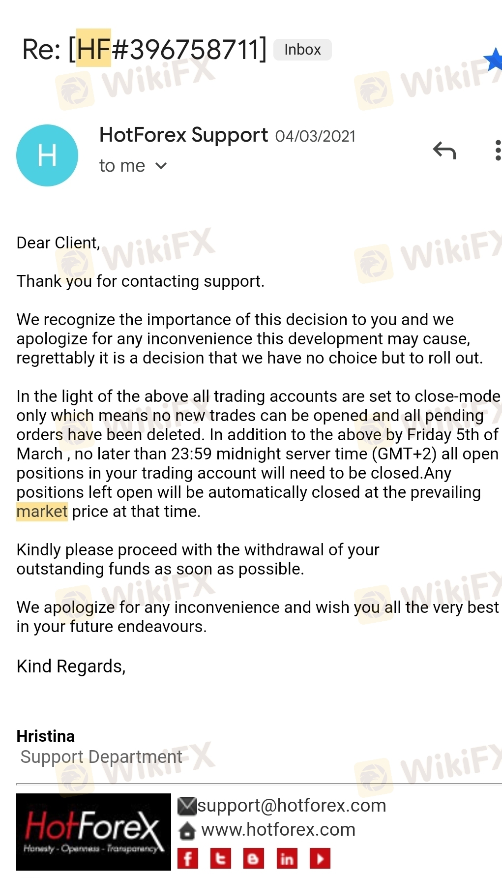 HF markets Date of sending the complaint to hf markets: March 12th, 2021 Date Today : Jun 24th,2022 Dear hf markets: I'm sending you this email to complain about exposing your business to Iran and against Iran imposed sanctions, that resulted your weird behaviors. The misconducting that caused me and my client' heavy losses. The parts that you are held liable for my losses are : 1 - By suddenly increasing the commissions and spreads , you made my account solely for the purpose of maximizing your commissions, which is a serious fraud. 2- You failed several times to provide me with the real-time securities prices, and to the worse, you sold some of my holdings/positions based on your unreal estimated prices which then found out to be far from the real prices. As those stocks were never reached at the prices that you made the transactions upon. You are definitely liable for the losses that resulted. 3 - By not allowing to hedge my positions, you took away all the tools that you had to make available to me to stop the losses. If you were complying with the regulations on sanctions against Iran, you didn't have to cut us off in the middle of our active transactions, and to make us huge losses. Sanctions and restrictions are imposed by authorities in the US, EU and elsewhere. The penalties for breaching sanctions are severe. All companies which trade with Iran or which make or receive payments to or from natural persons in Iran are subject to those penalties. I'm entitled to receive all the money that That you have harmed me and my client by not following the rules The exact amount that I expect to get back is ..... After a very long time, no action was taken against my protest Hereby I notify you, if you do not resolve this I will file complaints with the appropriate consumer agencies , as well as with FINRA , with authorities in the US, EU , with your base country and consider my legal alternatives My hf :977447
