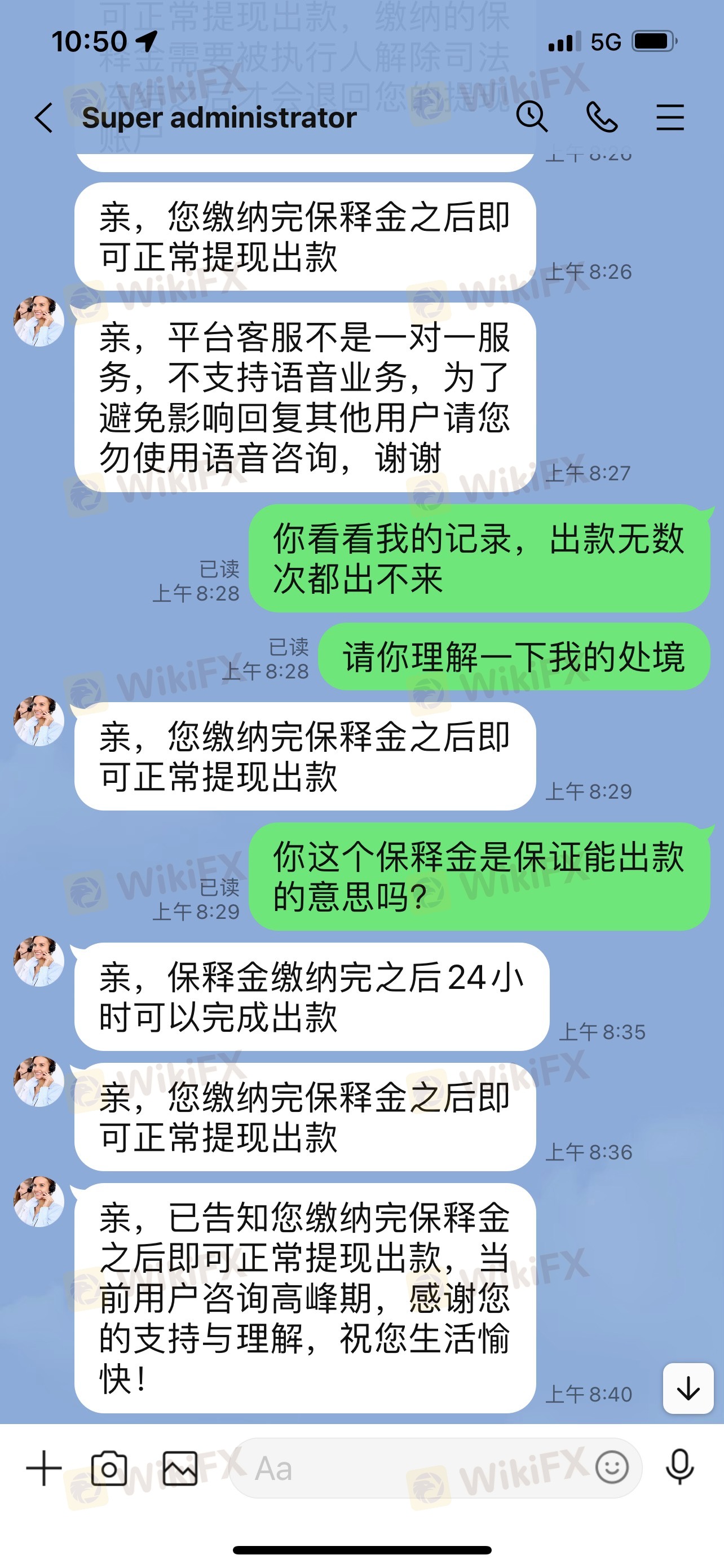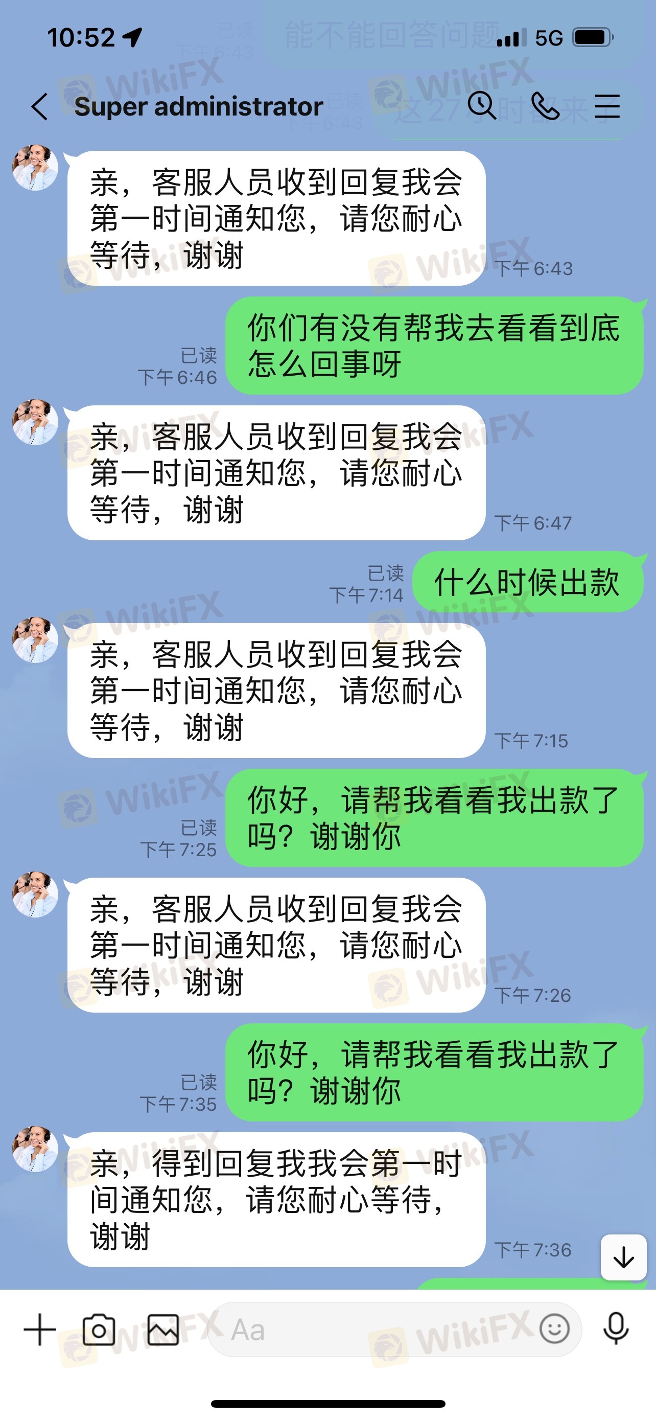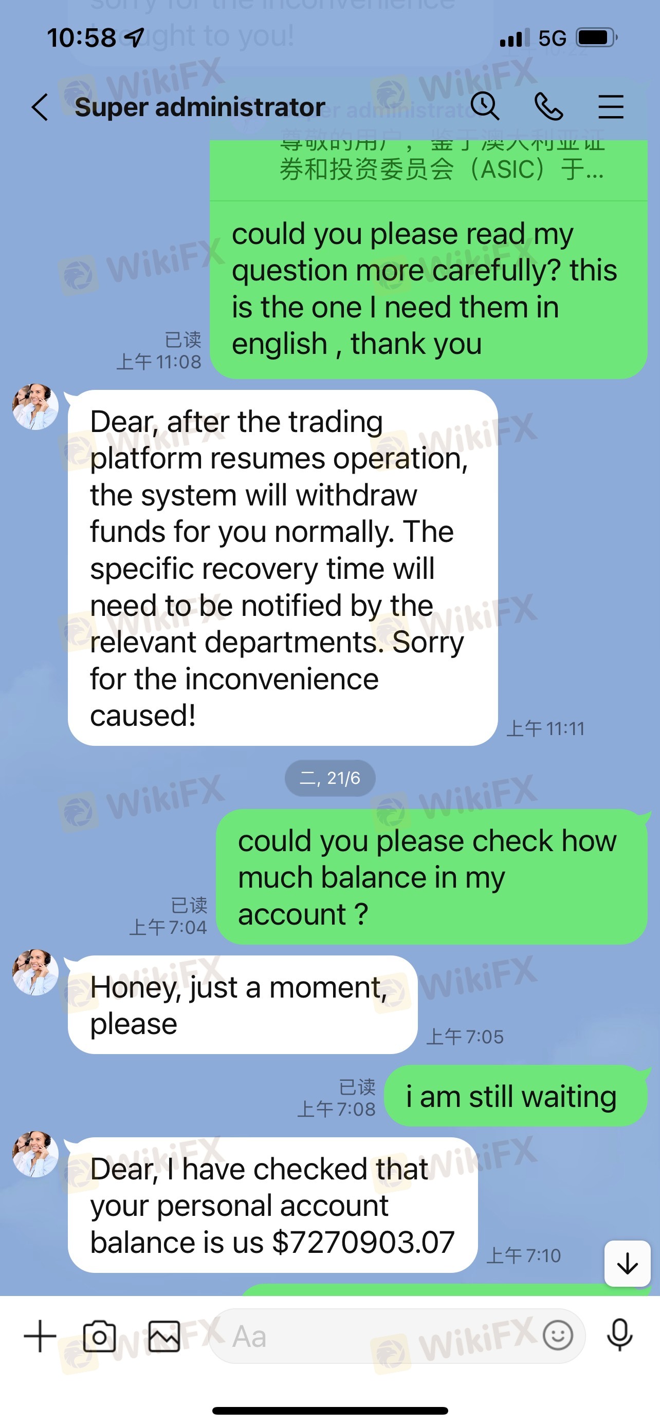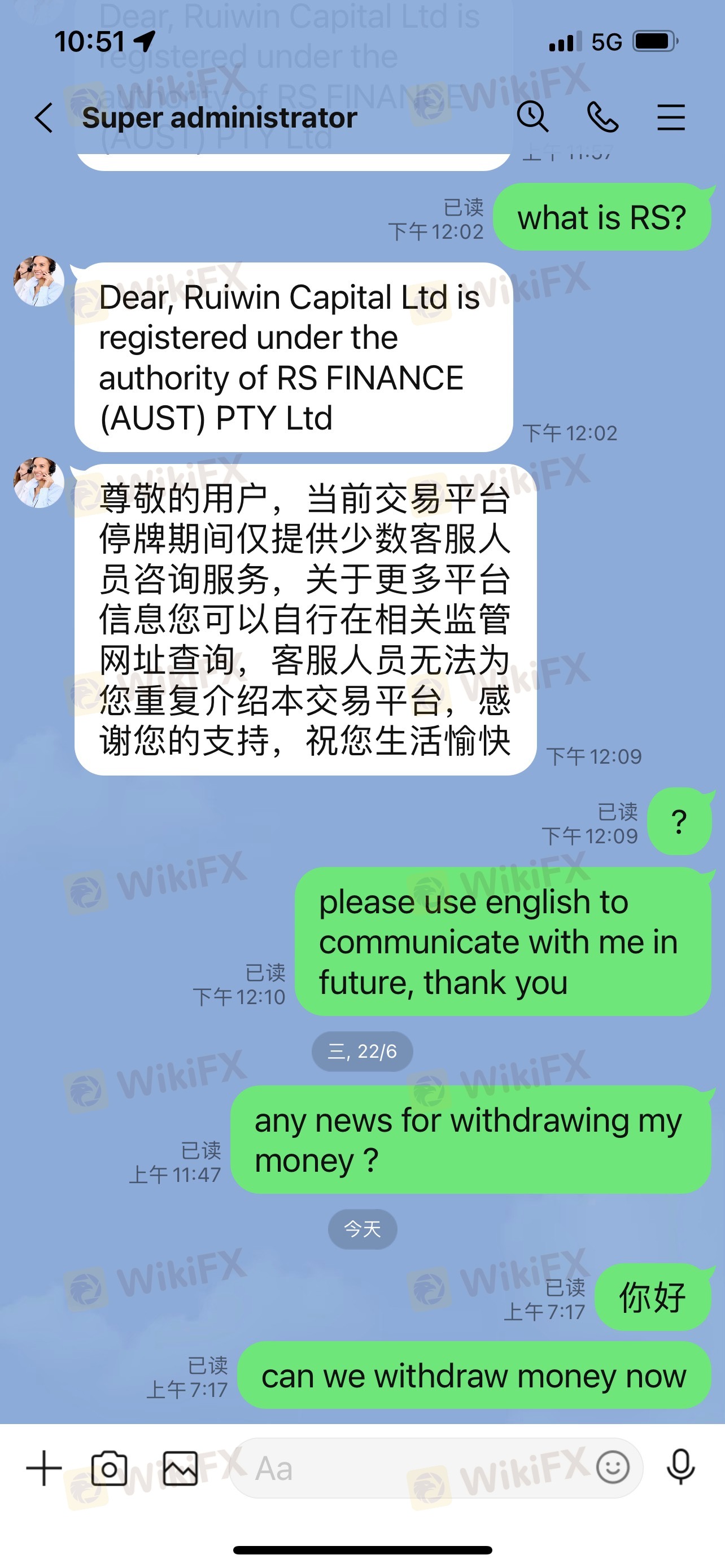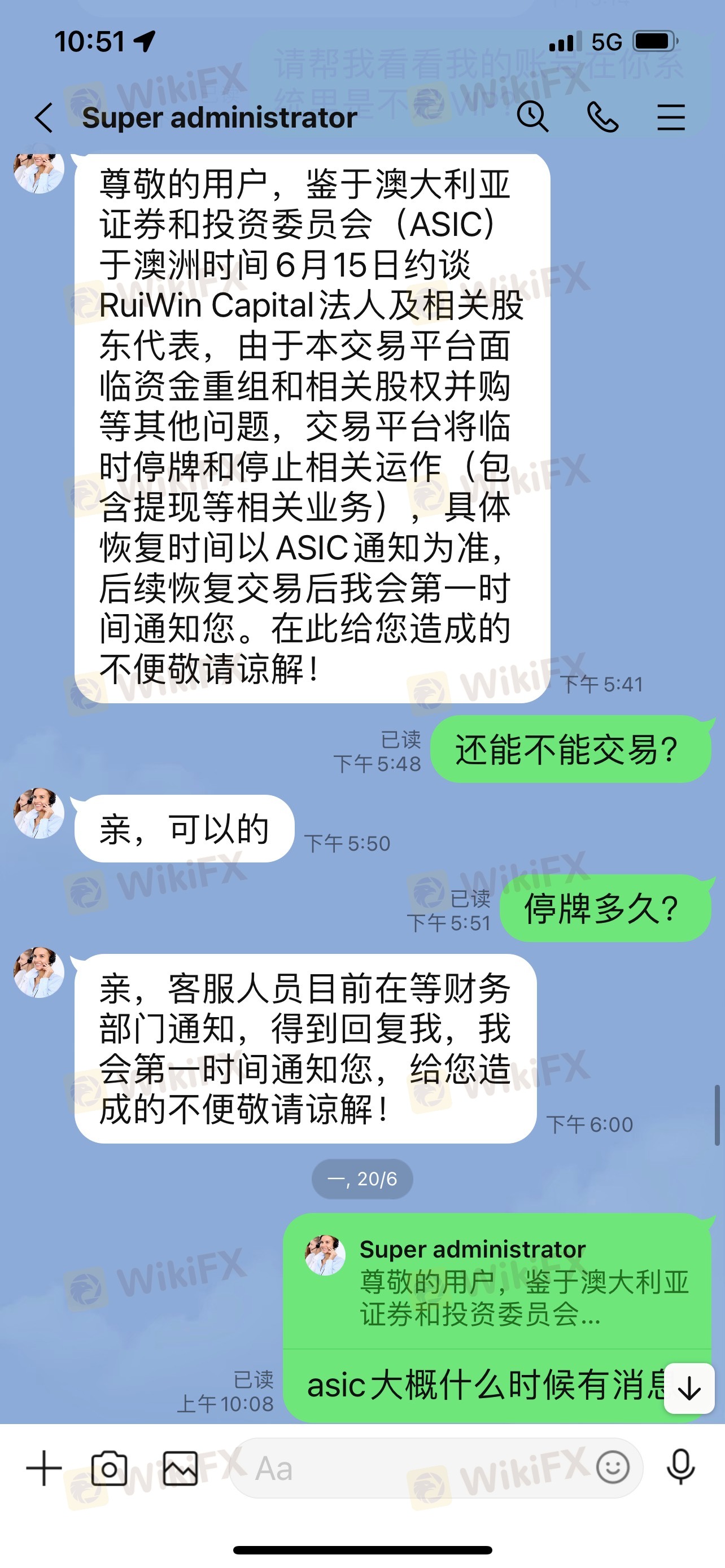 從6月開始,平臺就無法出金,“尊敬的用戶,鑒于澳大利亞證券和投資委員會(ASIC)于澳洲時間6月15日約談RuiWin Capital法人及相關股東代表,由于本交易平臺面臨資金重組和相關股權并購等其他問題,交易平臺將臨時停牌和停止相關運作(包含提現等相關業務),具體恢復時間以ASIC通知為準,后續恢復交易后我會第一時間通知您。在此給您造成的不便敬請諒解!”一直到現在都1個多月了,現在連客服都聯系不上了!