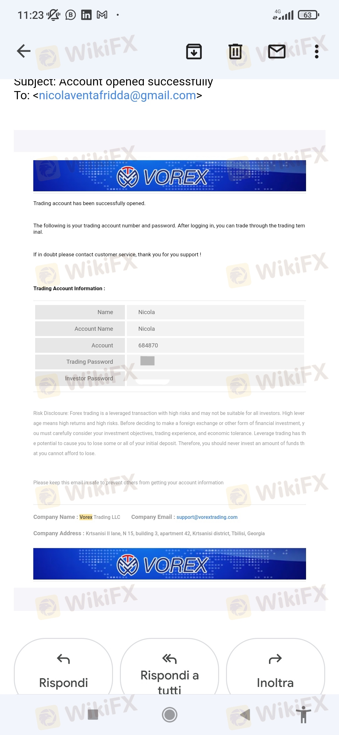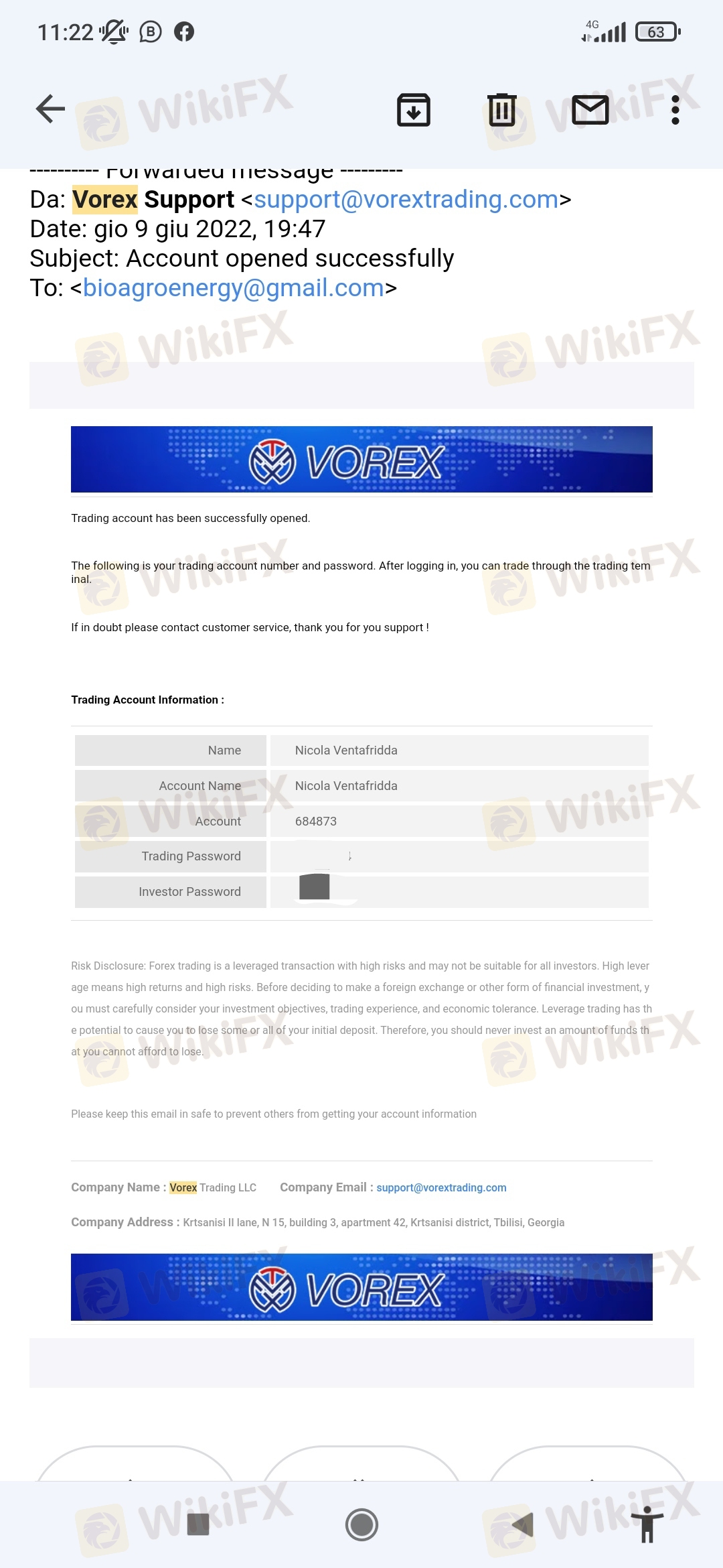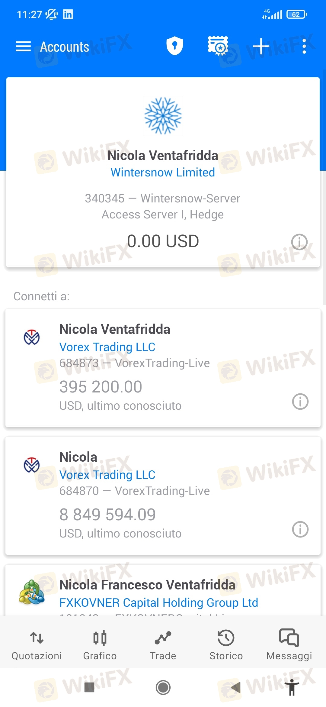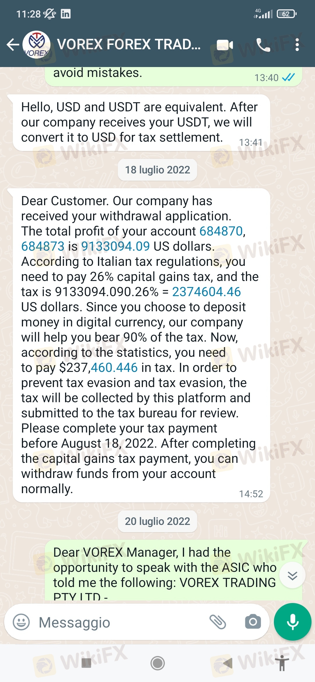 Hi, I'm Nicola Ventafridda and I have two VOREX accounts (initially FXKOVNER): no. 684870 (with a balance of 8,849,549.09 USD) and no. 684873 (with a balance of 395,200.00). When I tried to ask to withdraw sums from the accounts I was told that I would have to pay 10% of taxes without any reason (see the ASIC's answer about my question) and above all on the balance of both accounts. Attached are the screenshots of the proofs of my statements. I believe I have the right to recover my sums and pay taxes to my country.