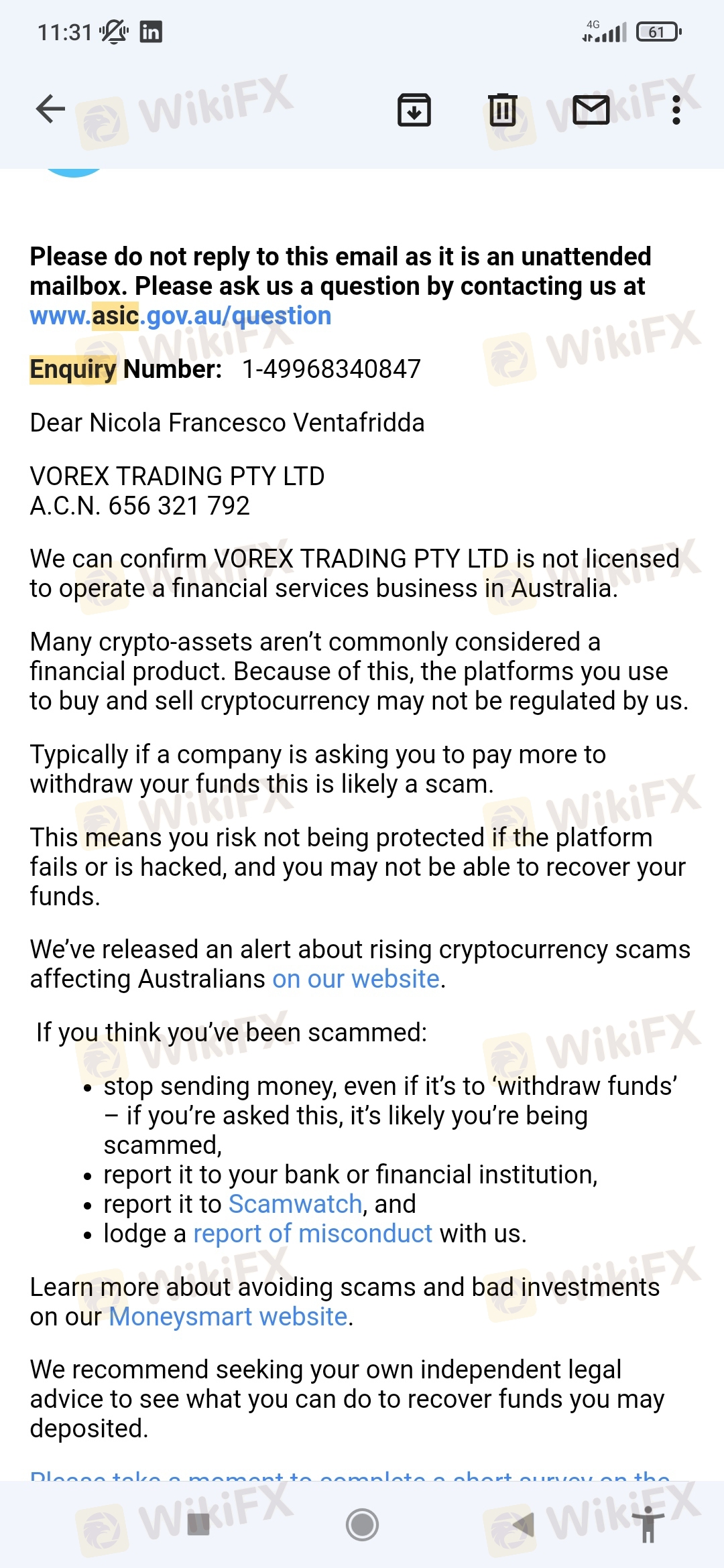 嗨,我是nicola ventafridda,我有兩個VOREX帳戶(最初是 fxkovner):684870(余額為 8,849,549.09 美元)和684873(余額為 395,200.00)。當我試圖要求從賬戶中取款時,我被告知我必須無緣無故地支付10%的稅款(請參閱 asic 對我的問題的回答),最重要的是兩個賬戶的余額。附上我的陳述證明的截圖。我相信我有權追回我的款項并向我的國家納稅。