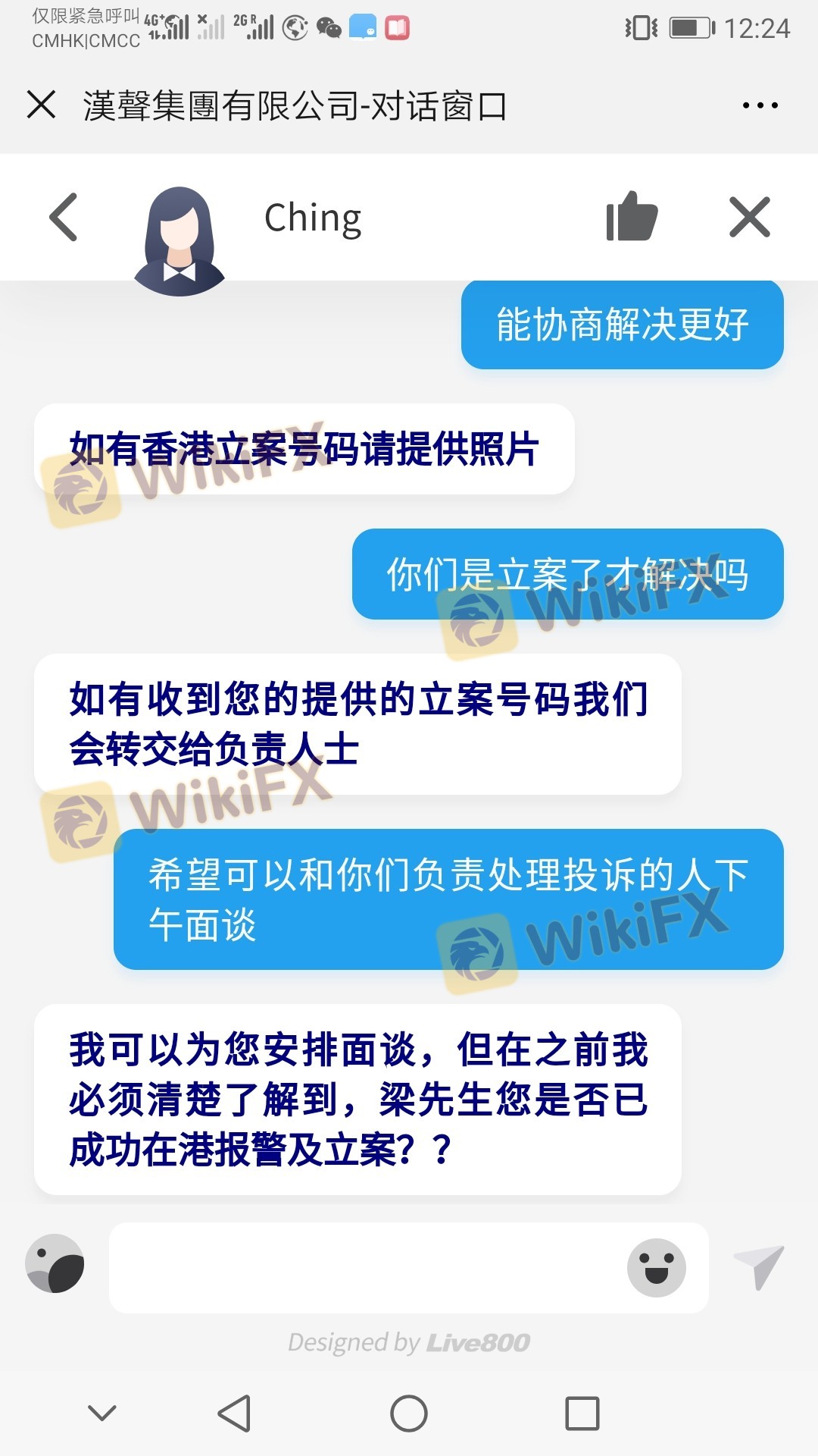 2018年7月開戶做單,公司人員介紹開戶,8月價又代客操盤,連續幾月虧損,每次虧都說有信心賺回來,連續8次入金,最終虧損160萬人民幣。 從1月份在國內報案,在公司投訴,公司一直推拖是代理責任,我多次打電話發郵件給公司,要求公司調查處理,并退償代理詐騙做單獲得的收入,公司一直推諉,說研究一直不回復,前期聯系我的經理也找不到人,無奈5月28日我去香港找漢聲,前臺金姓女士說請示管理層,答復說一星期后才能回來約談,欺我在香港只能呆一周。沒有解決問題的誠意和口碑。先后去了警署報警,金銀業貿易場,香港金管局。再次曝光!