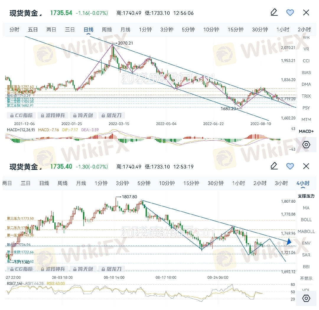 金银下跌因美联储主席鲍威尔鹰派发言,美联储在经济放缓的情况下仍决心激进加息以对抗通胀的担忧挥之不去。回涨则更多的考虑为技术面回调。