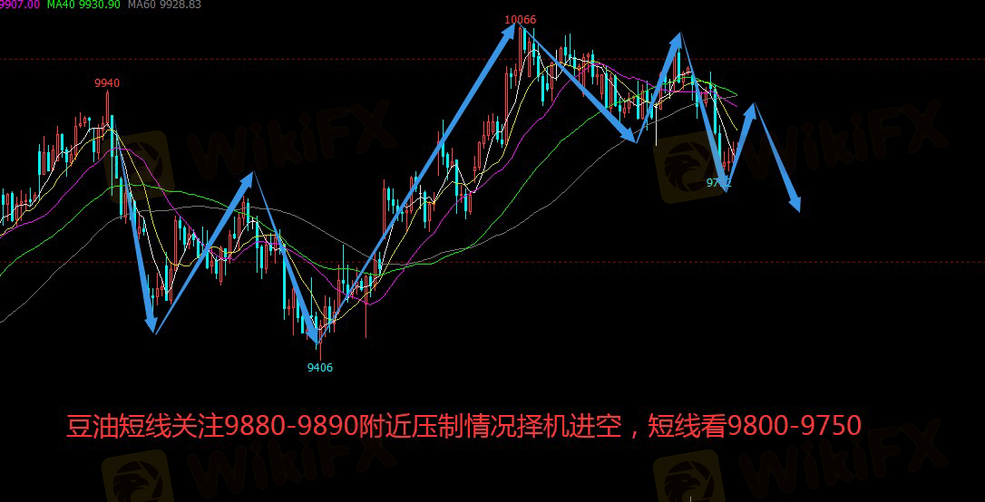豆油01合约:豆油今天技术面回落突破短时低点,前期几波冲高前高压制都没有突破,说明整体的反弹力度不足,目前技术面回落趋势有转弱的可能性,建议短线反弹空为主要思路,短线关注9880-9890附近压制情况择机进空,短线看9800-9750(投资建议 仅供参考 具体以实盘操作为主)