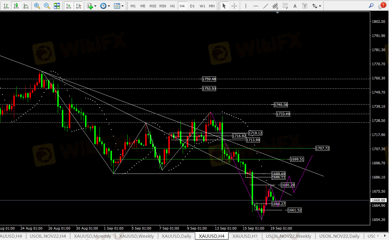 思路:周线和日线短期都显示空头,日内基本以空为主。价格站稳1682会近一步反弹试探1694-98一线。