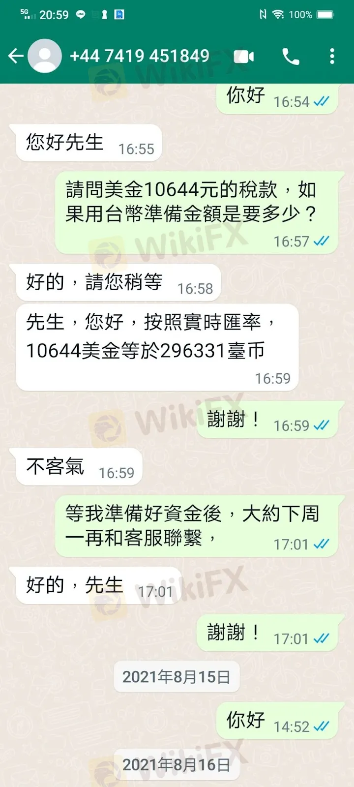 平台要求他繳納10000多元、百分之十的美金的稅額,先不論劉先生入金多少,百分之十的比例,以一次平台的出入金來說,都是太不合理的負擔!而劉先生很快察覺到不妙,和客服說準備好資金之後會再次聯繫